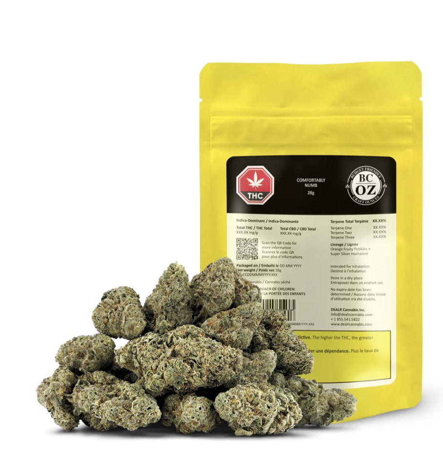 Comfortably Numb drifts from Orange Fruity Pebbles and Super Silver Hashplant, an indica-dominant that hums with an intense, crystalline presence glowing like stage lights through the haze. It’s not a traditional cultivar, it comes on heavy, with resin-soaked buds carrying a chorus of bright orange zest, candied fruit, and deep hash notes. Fresh pine and fuel aromas rise alongside fruity undertones, shaping a profile that lingers like a song in the dark, echoes carried on a long refrain.
