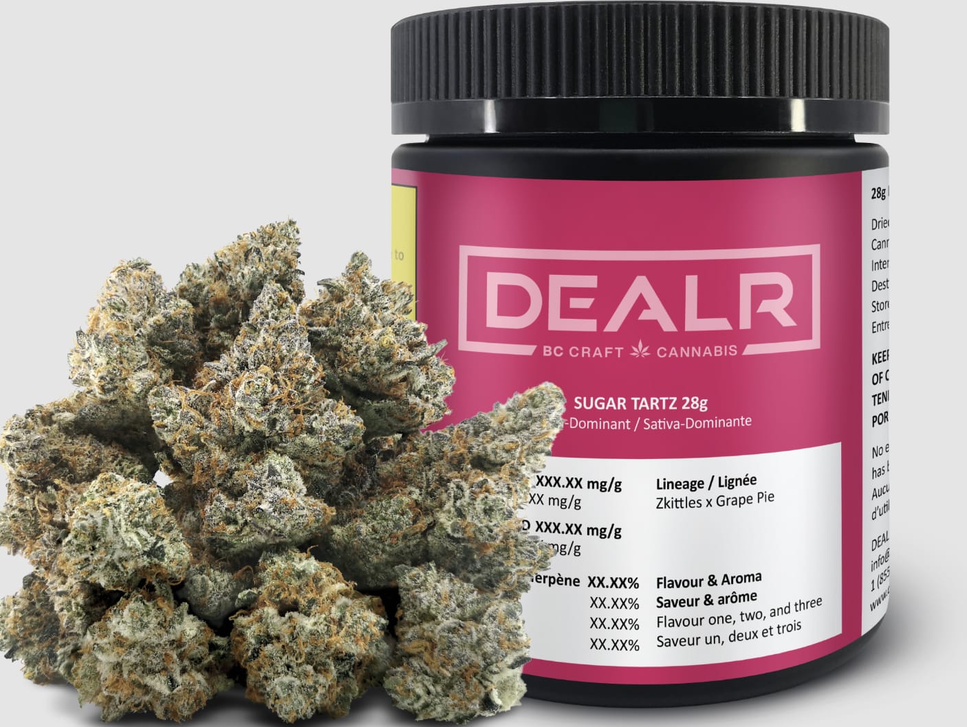 Available for a limited time only. Treat your senses to the irresistible aroma of Sugar Tartz, a sativa-dominant cultivar blending the flavours of sweet grapes, light berries, and earthiness thanks to its parentage of Zkittles X Grape Pie. Adorned with neon-green sugar leaves and prominent trichomes, this cultivar offers a visually striking presentation. Dominant terpenes include Limonene, Beta-Myrcene, and Linalool.